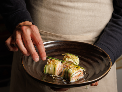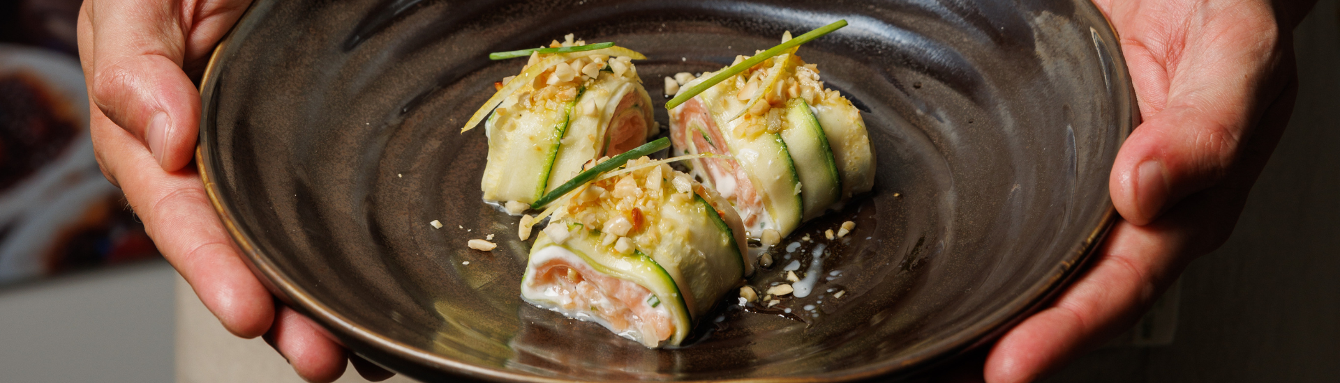 ROTOLO DI ZUCCHINE GRIGLIATE CON SALMONE E MANDORLE
