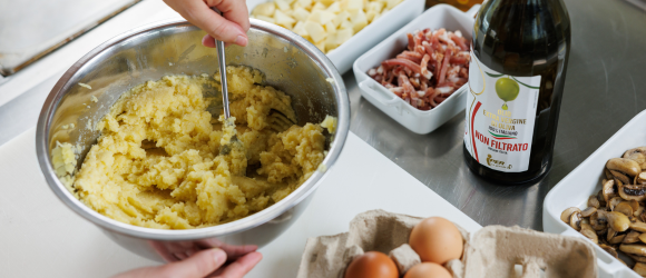 Quando le patate saranno pronte aggiungere l'uovo, il parmigiano reggiano grattugiato, il pangrattato, un pizzico di sale e di pepe, un filo di olio e amalgamare tutti gli ingredienti ottenendo un composto omogeneo