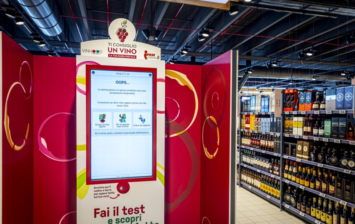 Abbiamo installato, in tutti i nostri ipermercati, dei chioschi interattivi in grado di aiutare i clienti nella** scelta del vino perfetto e dell’abbinamento di quest’ultimo** con una ricetta specifica. Una vera e propria Guida Digitale che, in modo semplice e pratico, indirizza il cliente verso la selezione migliore, grazie alla profilazione del suo gusto personale in materia di vini.